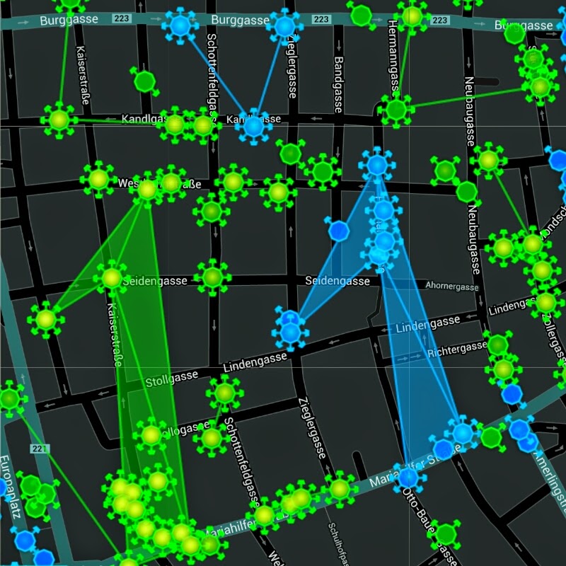 The agents met at 10 pm at St. Stephen’s Cathedral and have been grouped in teams by agent smover (enl.). The teams were split to three cars, one pedestrian team and one bike team. Brunzbub (enl.) had been the operator for this night (his debut) and checked the Intel map for crosslinks and other unforeseen events.