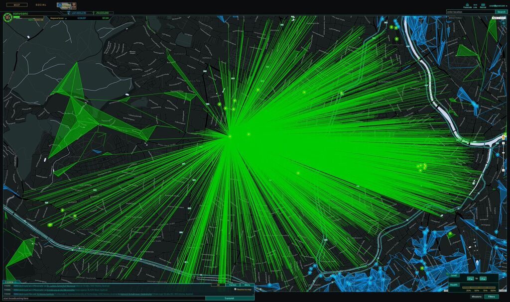 The plan for this field was created by special agent mhmnn. Chief pilot and operator smover guided around ten teams through a strategic takedown of all blocking links. Sadly we had to take down two big fields (around 80k) around Vienna to create this field, sorry to the building agents Olib and CloudNightwalker. For some reason the intel map was lagging a bit and on our screenshot you can see the main fields and the two fields we had to take down.