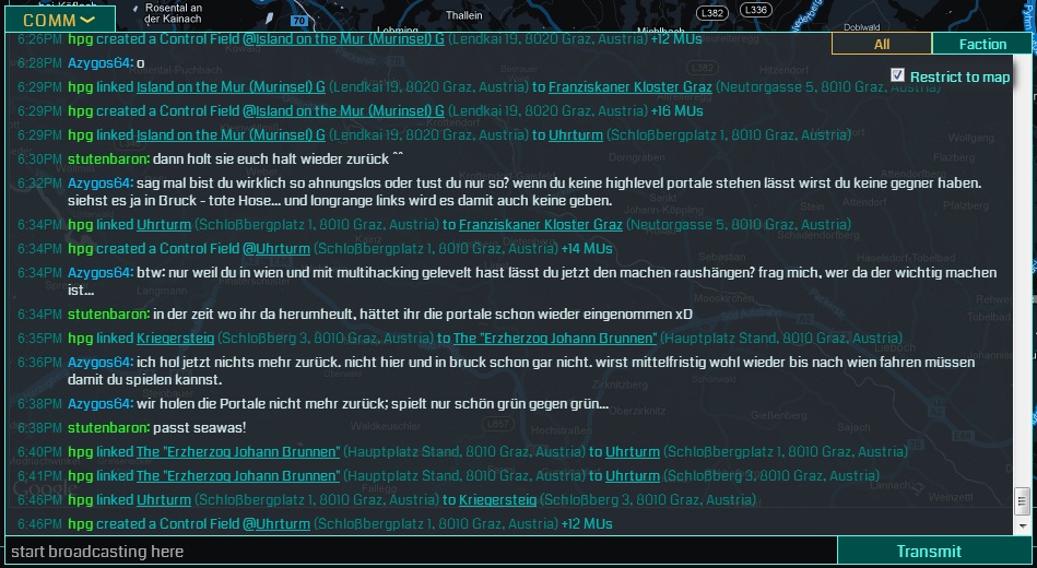 Wer nicht Ingress spielen kann so wie ich, aber trotzdem Spaß am Game haben möchte, kann ja mal den COMM Chat von Graz durchlesen. Da geht’s ja so richtig rund!